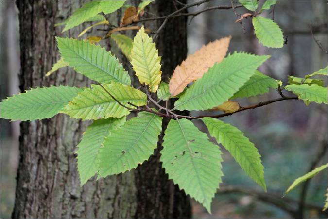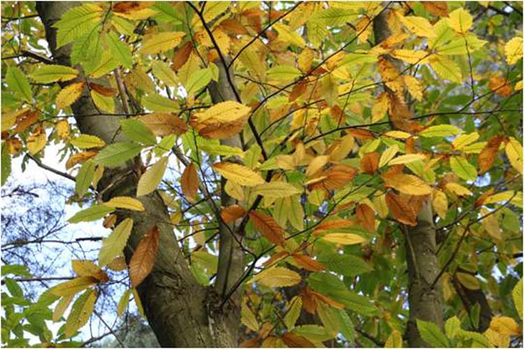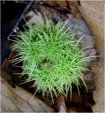 Long and large leaves with saw-tooth edges and spiky green cases containing chestnuts.